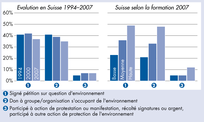 | Engagement écologiste lors des cinq dernières années en pourcent - Evolution en Suisse 1994–2007 et selon la formation 2007 |
