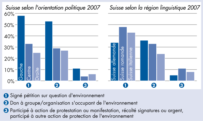 Engagement écologiste lors des cinq dernières années en pourcent - Suisse selon l'orientation politique et la région linguistique 2007 |