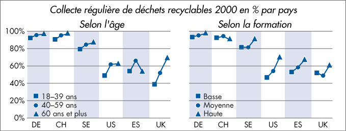 | Collecte régulière de déchets recyclables 2000 en % par pays - Selon l'âge et selon la formation |