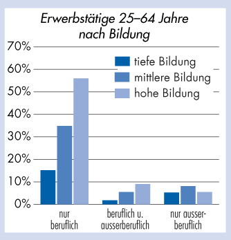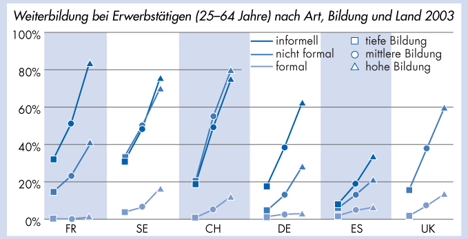 | Weiterbildung bei Erwerbstätigen (25–64 Jahre), nach Art, Bildung und Land 2003 |
