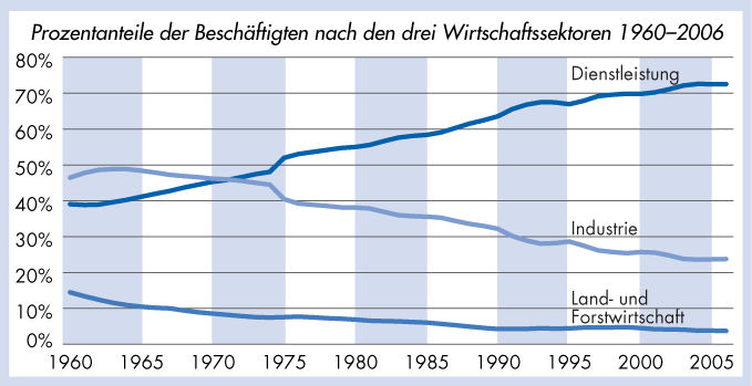 | Prozentanteile der Beschäftigten nach den drei Wirtschaftssektoren 1960–2006 |