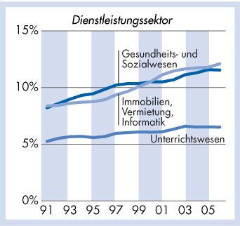 Zu- und Abnahme der Beschäftigung in ausgewählten Branchen 1991–2006: Dienstleistungssektor |