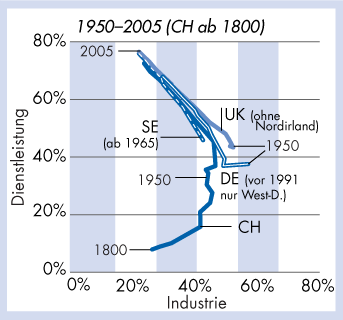 | Beschäftigte im Industrie- und Dienstleistungssektor in Prozent nach Land, 1950–2005 (CH ab 1800) |