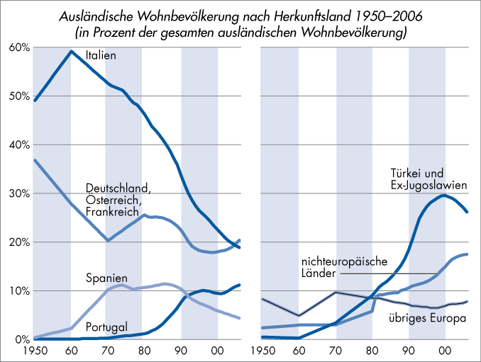 Ausländische Wohnbevölkerung nach Herkunftsland 1950–2006 (in Prozent der gesamten ausländischen Wohnbevölkerung)