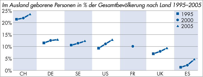 Im Ausland geborene Personen in Prozent der Gesamtbevölkerung nach Land 1995–2005
