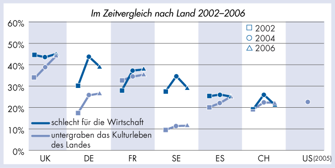 | «Zuwanderer sind schlecht für die Wirtschaft» und «Zuwanderer untergraben das Kulturleben des Landes» - Entwicklung nach Land 2002–2006 |