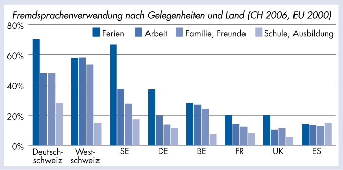 | Fremdsprachenverwendung nach Gelegenheiten und Land (CH 2006, EU 2000) |