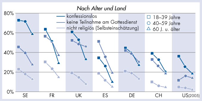 Religionslosigkeit (2002–2006 kumuliert) - Nach Alter und Land