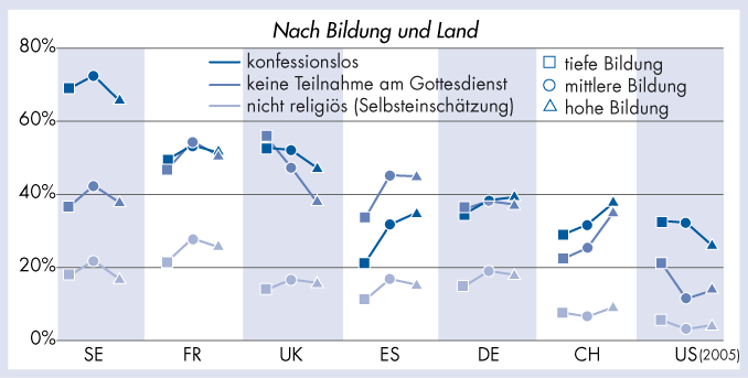 Religionslosigkeit (2002–2006 kumuliert) - Nach Bildung und Land