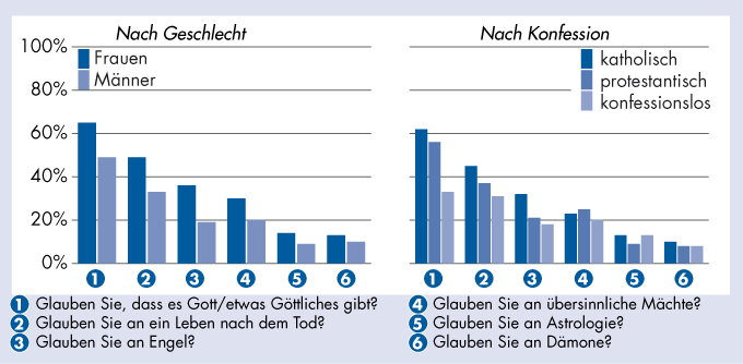 Glaubensinhalte: Alle Antworten «sehr» und «ziemlich» in Prozent 2007 – Nach Geschlecht und Konfession