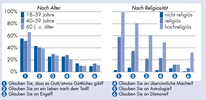 Glaubensinhalte: Alle Antworten «sehr» und «ziemlich» in Prozent 2007 – Nach Alter und Religiosität