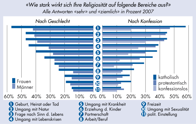 «Wie stark wirkt sich Ihre Religiosität auf folgende Bereiche aus?» Alle Antworten «sehr» und «ziemlich» in Prozent 2007 - Nach Geschlecht und Konfession