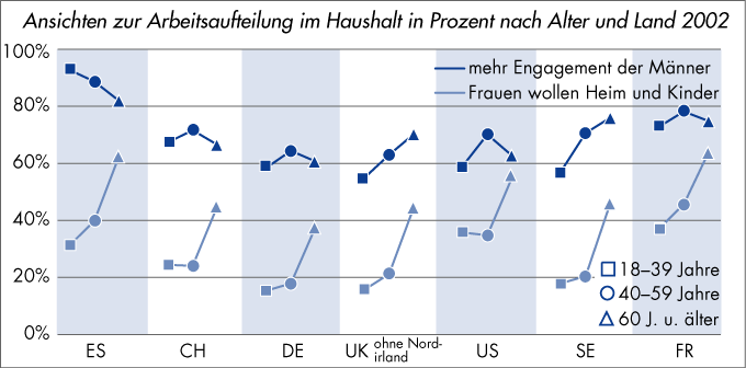 | Ansichten zur Arbeitsaufteilung im Haushalt in Prozent nach Alter und Land 2002 |