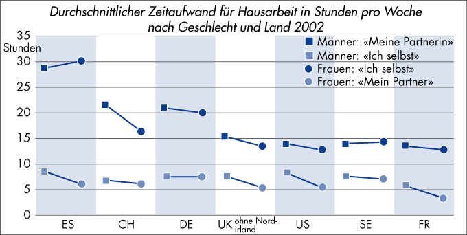 Durchschnittlicher Zeitaufwand für Hausarbeit in Stunden pro Woche nach Geschlecht und Land 2002 |