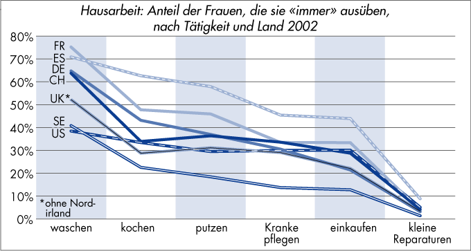 Hausarbeit: Anteil der Frauen, die sie «immer» ausüben, nach Tätigkeit und Land 2002 |