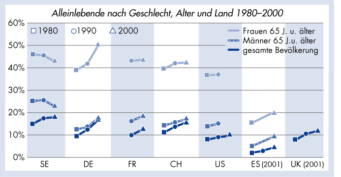Alleinlebende nach Geschlecht, Alter und Land 1980–2000