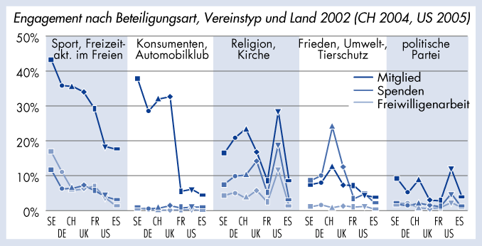 Engagement nach Beteiligungsart, Vereinstyp und Land 2002 (CH 2004, US 2005)