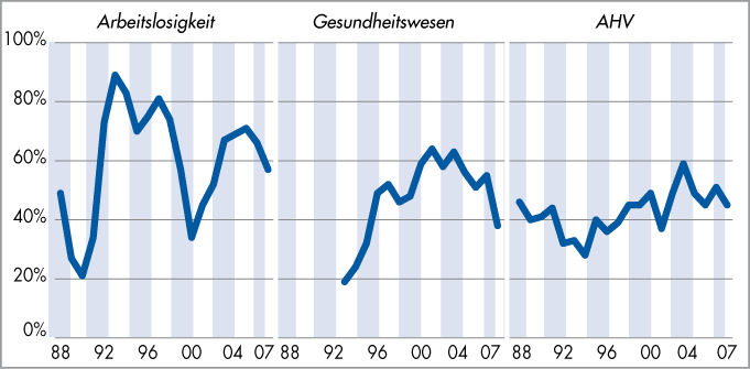 | «Welches sind für Sie die fünf grössten Probleme in der Schweiz?» 1988–2007 - Arbeitslosigkeit, Gesundheitswesen, AHV |