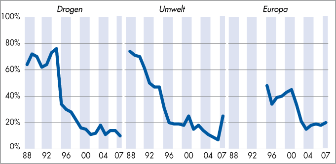 | «Welches sind für Sie die fünf grössten Probleme in der Schweiz?» 1988–2007 - Drogen, Umwelt, Europa |