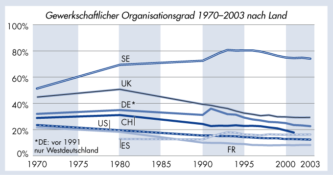 Gewerkschaftlicher Organisationsgrad 1970–2003 nach Land