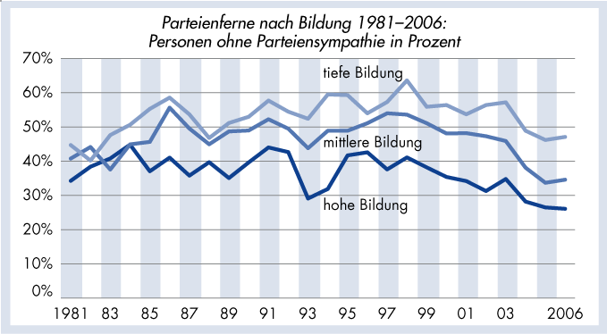 Parteienferne nach Bildung 1981–2006: Personen ohne Parteiensympathie in Prozent