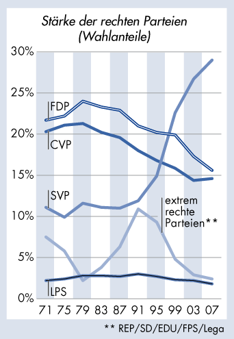 Parteien in der Schweiz: Nationalratswahlen 1971–2007 - Stärke der rechten Parteien (Wahlanteile) |