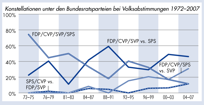 | Konstellationen unter den Bundesratsparteien bei Volksabstimmungen 1972–2007 |