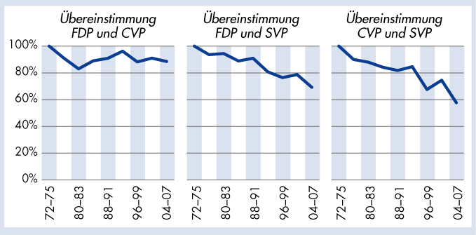 Parolenübereinstimmung zwischen den Bundesratsparteien bei eidgenössischen Volksabstimmungen in den Legislaturperioden 1972–2007 - Übereinstimmung FDP und CVP, FDP und SVP, CVP und SVP |
