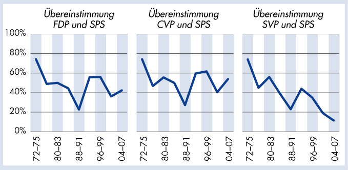 | Parolenübereinstimmung zwischen den Bundesratsparteien bei eidgenössischen Volksabstimmungen in den Legislaturperioden 1972–2007 - Übereinstimmung FDP und SPS, CVP und SPS, SVP und SPS |