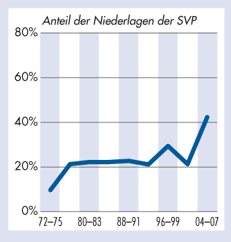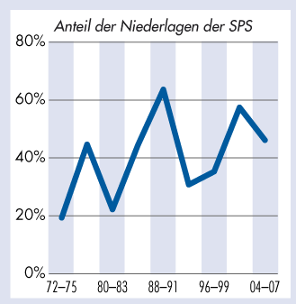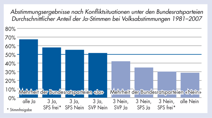 | Abstimmungsergebnisse nach Konfliktsituationen unter den Bundesratsparteien: durchschnittlicher Anteil der Ja-Stimmen bei Volksabstimmungen 1981–2007 |