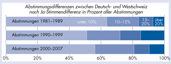 | Abweichendes Stimmverhalten bei eidgenössischen Volksabstimmungen - Abstimmungsdifferenzen zwischen Deutsch- und Westschweiz nach Ja- Stimmendifferenz, in Prozent aller Abstimmungen |