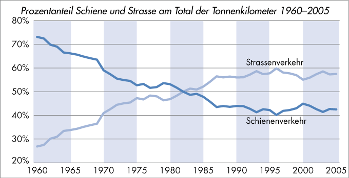 Prozentanteil Schiene und Strasse am Total der Tonnenkilometer 1960–2005