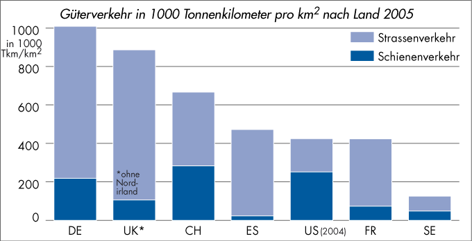 Güterverkehr in 1000 Tonnenkilometer pro km2 nach Land 2005