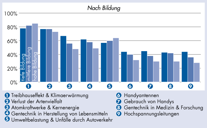 Einschätzung von Gefahren für Mensch und Umwelt 2007. Anwort «hoch» in Prozent, nach Bildung