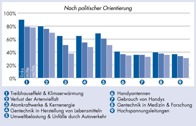 Einschätzung von Gefahren für Mensch und Umwelt 2007. Anwort «hoch» in Prozent, nach politischer Orientierung