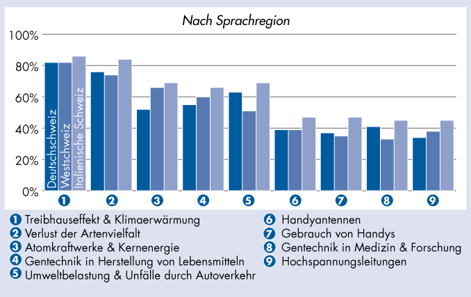 Einschätzung von Gefahren für Mensch und Umwelt 2007. Anwort «hoch» in Prozent, nach Sprachregion