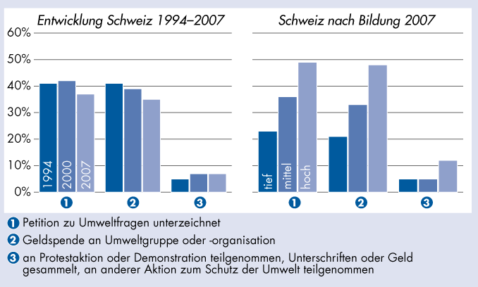 | Umweltpolitisches Engagement in den letzten fünf Jahren in Prozent – Entwicklung Schweiz 1994–2007 und nach Bildung 2007 |