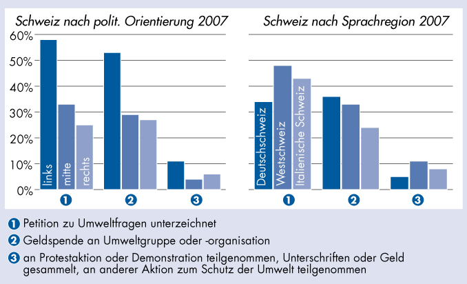 Umweltpolitisches Engagement in den letzten fünf Jahren in Prozent – Schweiz nach politischer Orientierung und nach Sprachregion 2007 |