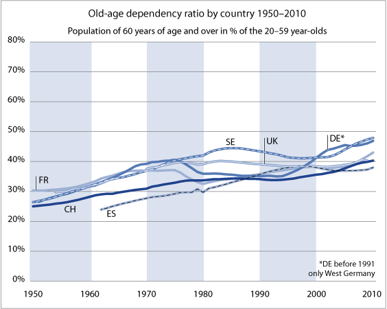 Old-age dependency ratio: population of 60 years of age and over in % of the 20-59-year-olds.