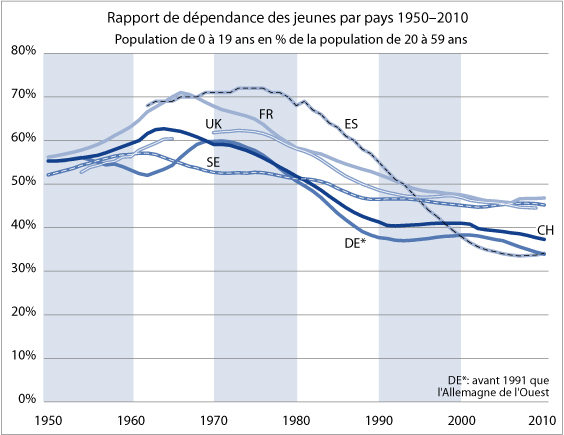 Rapport de dépendance des jeunes : population des 0 à 19 ans en pour-cent des 20 à 59 ans.
