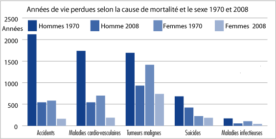 Taux de mortalité standardisé par âge entre la 1ère et la 70e année de vie.