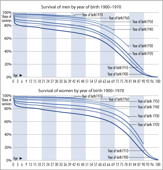 Surviving men and women based on age, as a percentage of live births in a specific cohort.