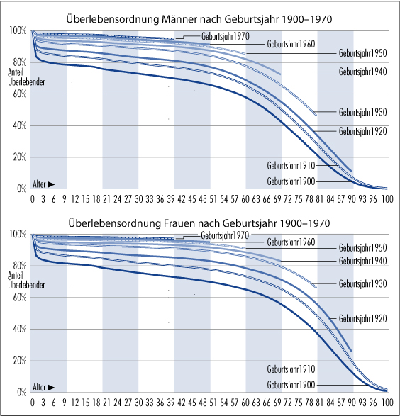 Überlebende Männer bzw. Frauen in jeweiligem Alter, bezogen auf 100% der Lebendgeburten eines spezifischen Geburtsjahrgangs.