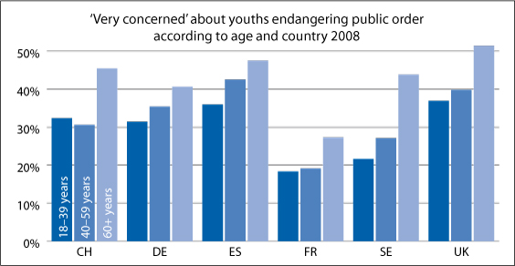 Question wording: “How worried are you about the current extent of criminality among people in their twenties?” Scale from 0 (not concerned at all) to 10 (extremely concerned); the shares of the values from 8-10 are given.