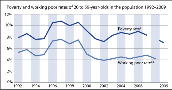 Working poor rate: share of the population aged 20-59 who are economically active and who live below the SKOS poverty line.