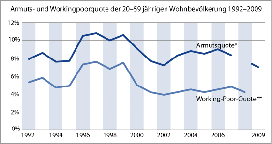 Armutsquote: Anteil der 20- bis 59-jährigen Wohnbevölkerung unterhalb der Armutsgrenze der Schweizerischen Konferenz für Sozialhilfe (SKOS).