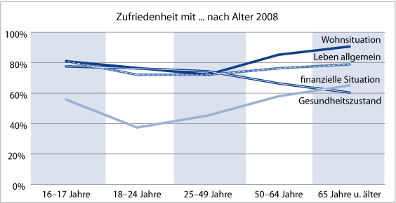Anteil der Personen ab 16 Jahren die sehr zufrieden sind mit ihrem Leben im Allgemeinen, ihrer Wohnsituation, ihrer finanziellen Situation und ihrem Gesundheitszustand.