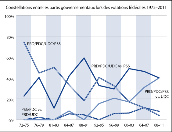 Source : 1972–2007 : Simon Hug et Ioannis Papadopoulos, Résultats des votations fédérales et prises de position des partis politiques et des groupes d’intérêt, Institut de science politique, Université de Berne ; 2008–2011 : www.swissvotes.ch