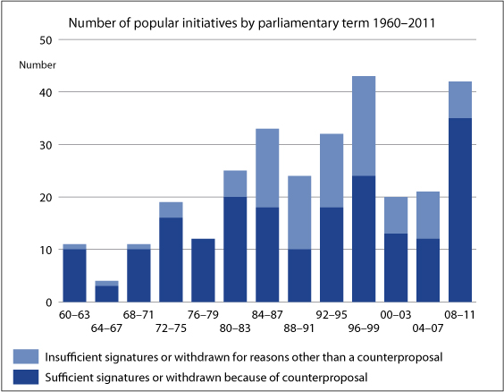 Initiatives: a proposal for a constitutional amendment or a new constitutional article is subject to popular vote if the proposal is signed by at least 100,000 citizens who have the right to vote. Since 1977, signatures have to be collected within a period of 18 months.