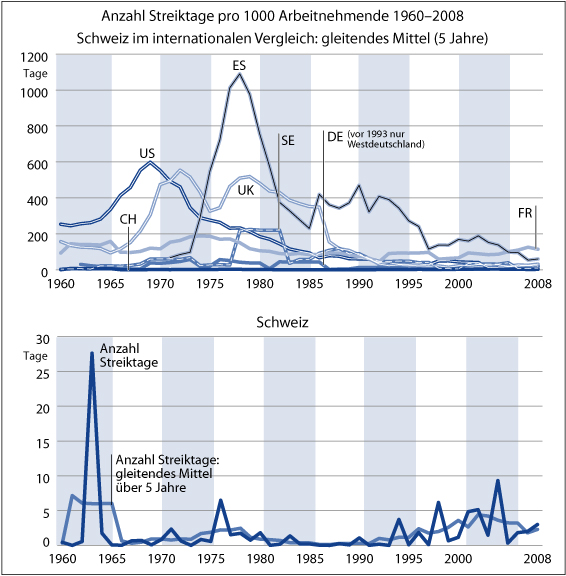 Angegeben sind Streiktage aufgrund von Streiks und Aussperrungen. Frankreich 1997–2005: geschätzte Werte (Eurostat), Gleitendes Mittel: siehe Glossar.